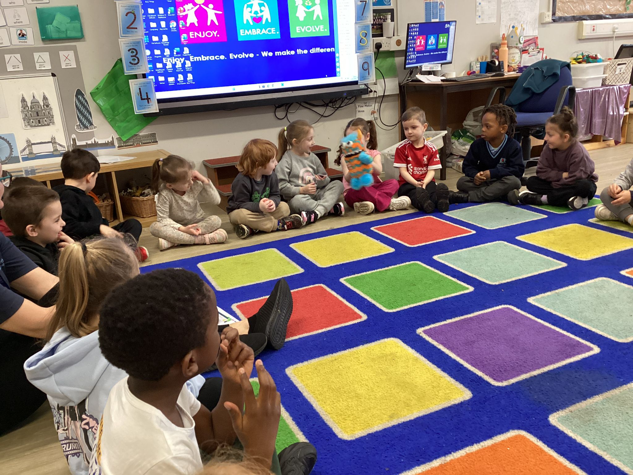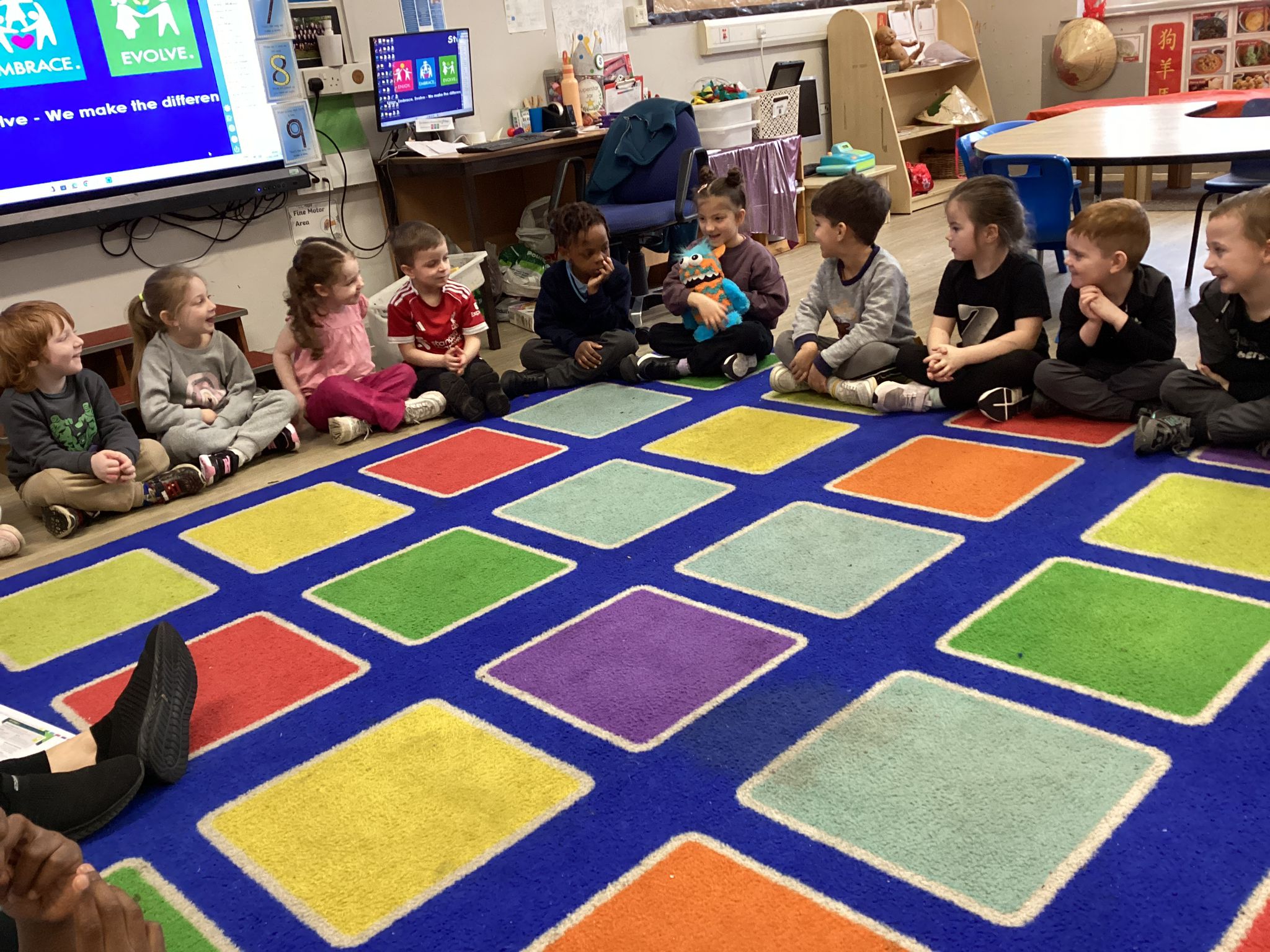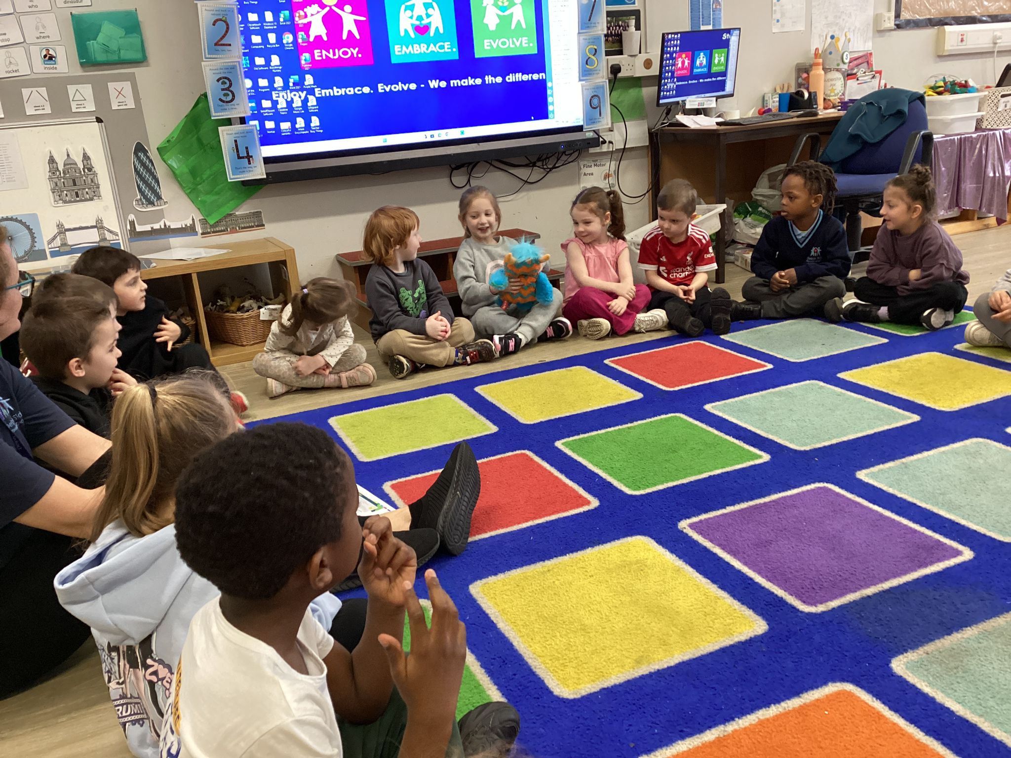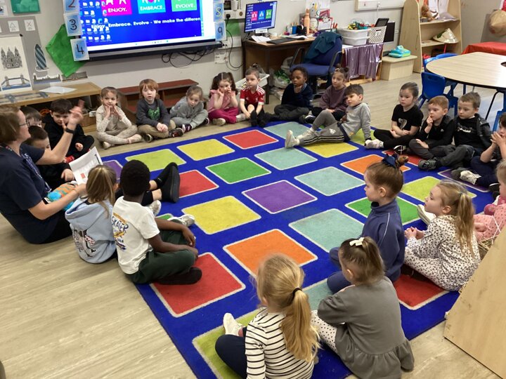 Reception marked Children’s Mental Health Day with a lovely Welcome Circle. We took part in a Welcome Circle, a simple but powerful activity designed to help children notice one another, use each other’s names, and practise inviting friends to play. We sat together in a circle and used a special soft toy as our “talking object” so everyone knew when it was their turn to speak. First, we modelled how to introduce ourselves by saying our name and something we enjoy. Then the children had a turn to share their own names as the toy was passed around the circle. In our second round, children were invited to use friendly words to ask a classmate to join them in an activity—many lovely invitations were shared, and we celebrated these moments of kindness. We finished by highlighting a few examples of thoughtful invites and encouraged everyone to think about who they might like to include in their play today. The children practised listening, taking turns, and showing care for their peers—small steps that help build a strong sense of belonging in our classroom.